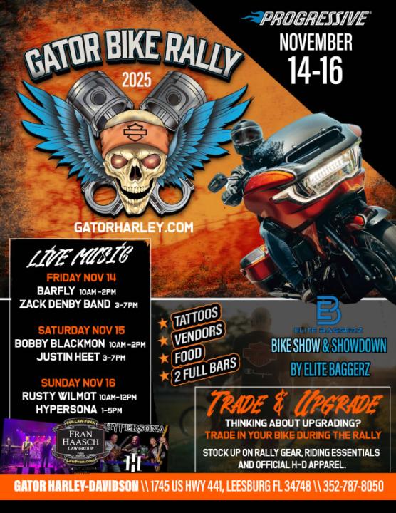 The 2025 Gator Bike Rally is rolling into Leesburg November 14–16 at Gator Harley-Davidson!